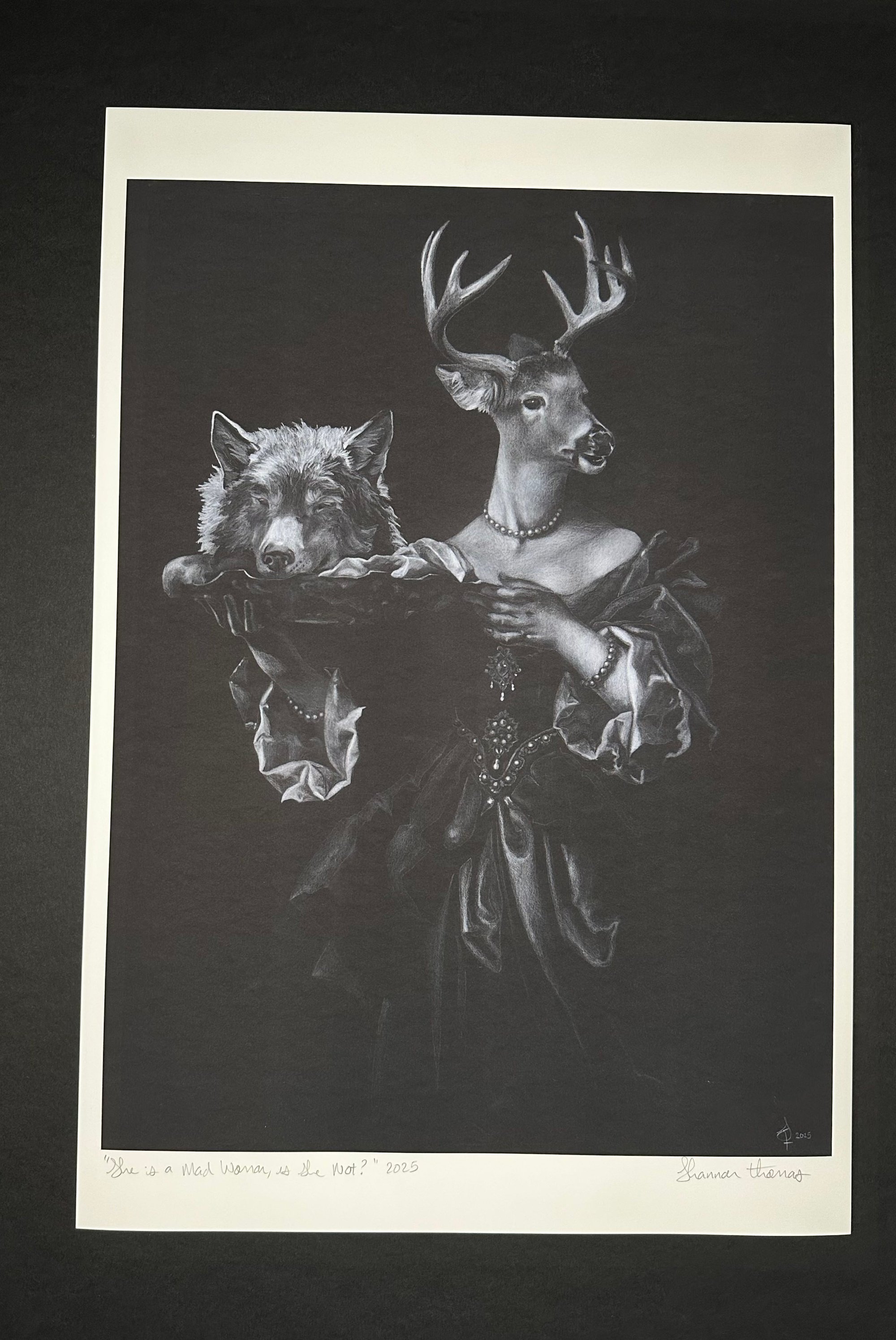 13x19in print of the white pencil drawing “She Is a Mad Woman, Is She Not?” on premium archival matte paper hand signed by the artist